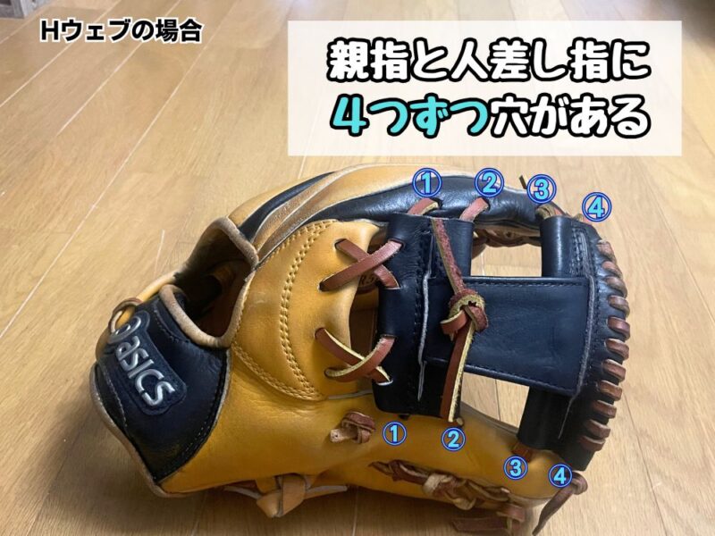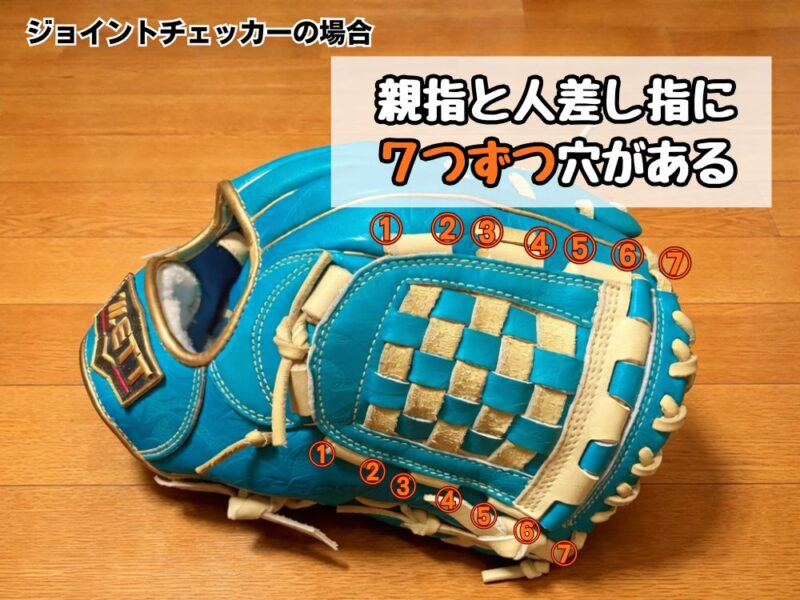 内野手用グローブで定番のHウェブでは親指と人差し指に4つずつ穴が開いているのに対して、ジョイントチェッカーウェブでは7つずつ穴が開いています。